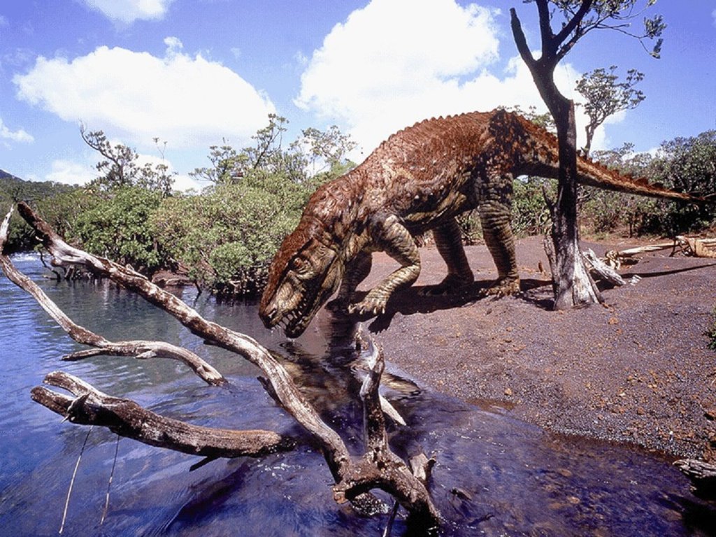 ↑波斯特鱷在《與恐龍共舞》中的劇照。被詮釋為多數時間四足步行,在捕獵時才用前肢輔助撲倒獵物;但新考表示波斯特鱷可能是純粹以後肢雙足步行的動物。